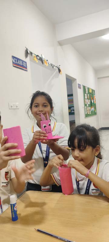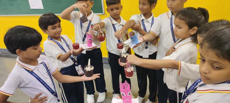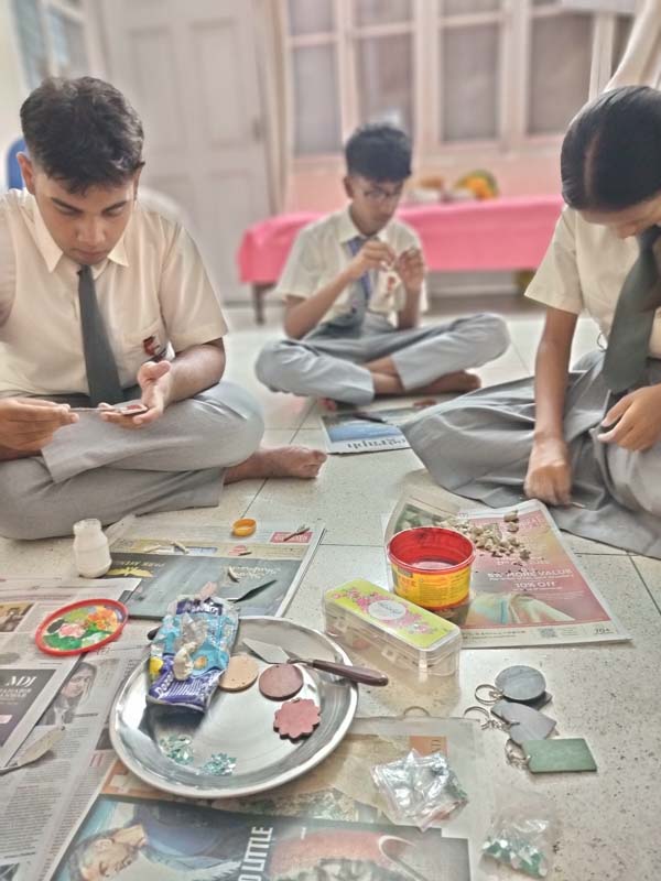 Lippan Art, also known as Mud and Mirror Work, is a traditional mural craft from the Kutch region of Gujarat, India. The children learned the procedure in a fun-filled and engaging way. The children learned to make penstands using recycled napkin rolls, decorated with colorful fluorescent papers and chocolate wrappers.